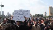 لافتة ٣ في الخلفية: لا للمحاكمات العسكرية، نعم للدولة المدنية